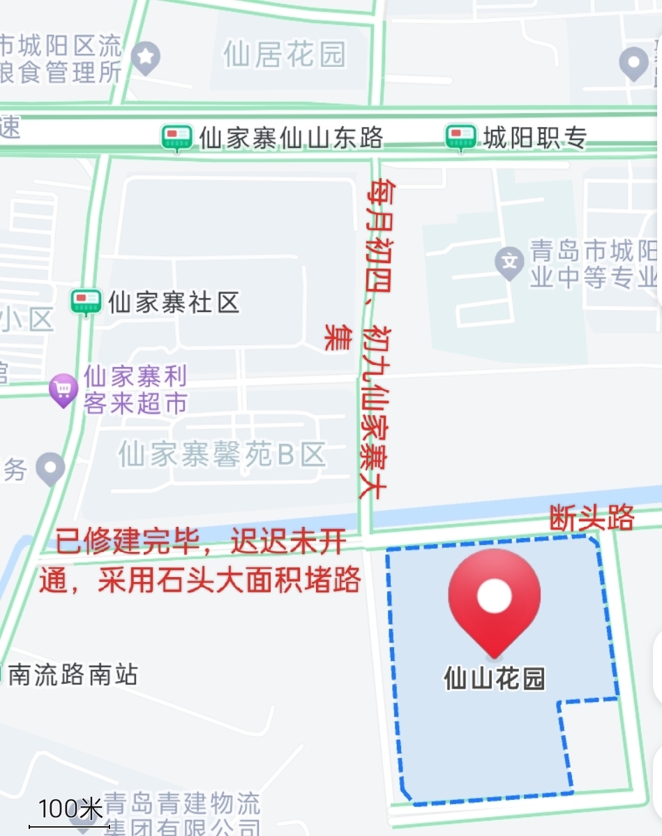 网民您好,感谢您对城阳区工作的关心和支持。经城阳区流亭街道办事处落实,仙家寨集市已有多年历史,每逢四逢九赶集,仙家寨社区在集市东面、南侧开辟了一条临时通道,逢集时居民可以通过此道路出入。同时街道将督查社区也加强集市管理,对摊位的摆放和运营进行梳理整顿。其中福亭路(规划纬四路)正在组织验收等工作,预计6月底前正式通车。