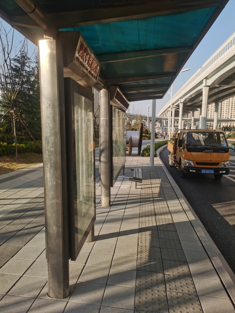 605路往市政府南通路方向重庆中路唐山路公交站牌应放置到候车亭里面,而且站牌放在道路上也不符合规范,其他站牌都是放在人行道上,没有放在道路上的,请尽快调整,回复请告知完成时间,请按照答复时间进行。