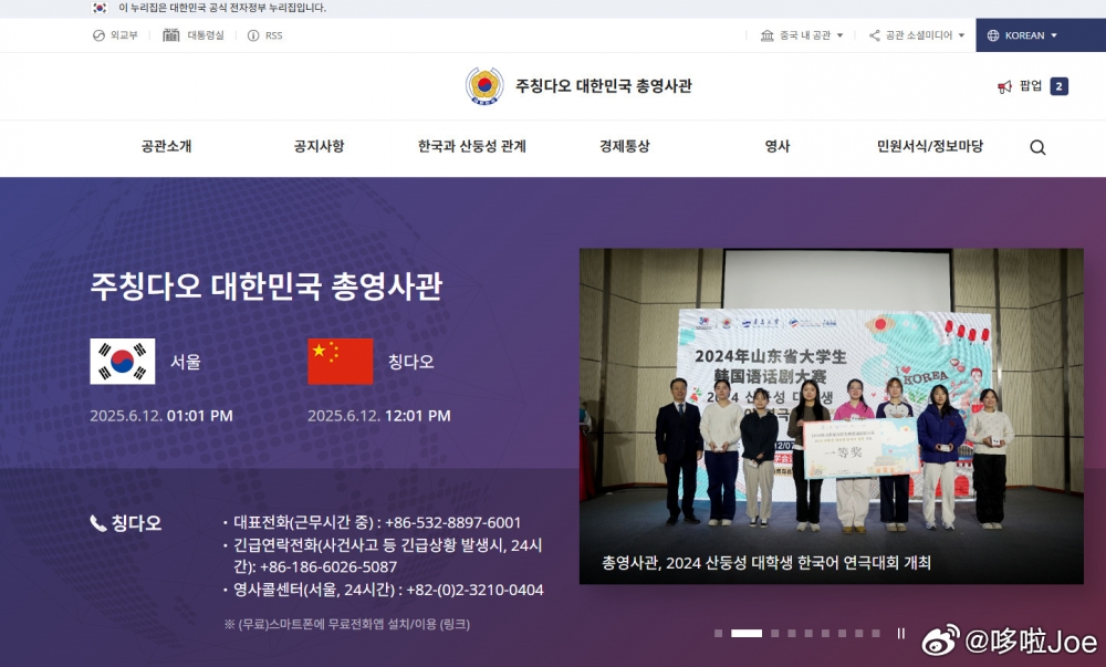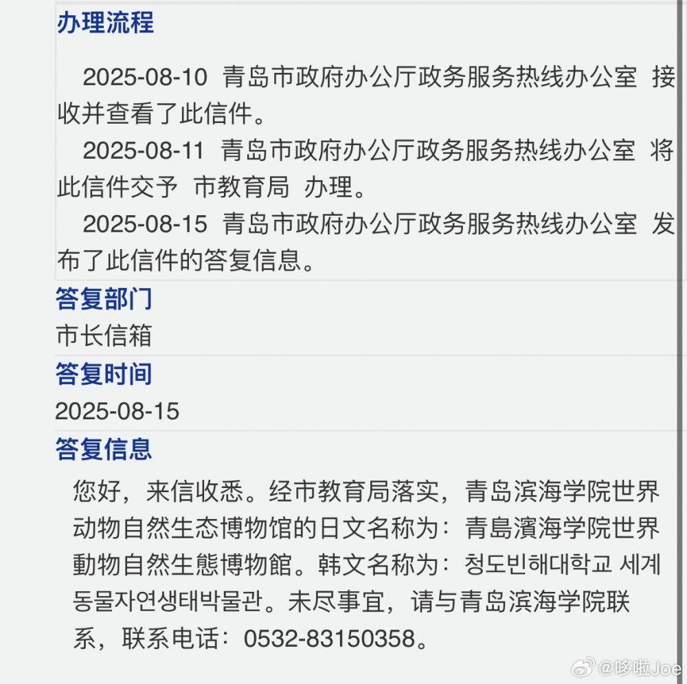 图1:青岛滨海学院世界动物自然生态博物馆景区官方韩文“青岛”翻译有误,韩国人习惯翻译为칭다오,更接近Qingdao原声发音翻译(参照图2大韩民国驻青岛总领事馆),应遵照韩国语标准翻译,毕竟是给韩国人看的,应重新梳理制定规范的官方韩文名称并修改景区所有涉及的地方,学校回复青岛学校都是这样翻译说法有误,青岛科大韩文就是正确的韩国本土译写青岛的칭다오(图3),请市教育局督导青岛滨海学院对青岛滨海学院世界动物自然生态博物馆韩文问题尽快整改,不要继续以其他理由拒不整改,回复请告知整改完成时间。